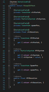 Using the AudioManager and VisualEffectManager classes, simple functions can activate/deactivate sounds and vfx. I created two data structures with several properties. These include a prefab for vfx and an audio clip for sounds. The effects and sounds are reusable if they are not currently active and match with the one that is trying to be played, saving memory and avoiding the deletion of objects. This approach allows for global world effects and sounds with ease and avoids having to spawn new objects. Scene audio and vfx objects placed before runtime are possible by assigning the particle system or audio source to the inspector. The data structure (using System.Serializable) allows multiple classes to reference these effects and sounds. All the properties of these sounds and visual effects can be customised inside the inspector, keeping code clean and minimal.