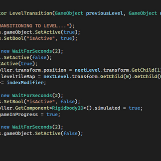 The Shattered Realm is a dimension that includes a combination of levels. Doing so has proved useful, as the game will cover diverse environments, but in a more restrictive setting. Levels are linearly connected, and the player traverses through the realm using portals. On completion of the run, the player is given a score that they can aim to improve upon in the future. The implementation for this mode included instantiating levels randomly as prefabs, and creating a transition using an IEnumarator method. To achieve the transition, I simply used an animation that would fade the loading screen in and out following a boolean.