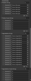 The recipe class represents a potion, and includes the ingredients required, name, icon and description. The potion and ingredient inventory was an essential aspect of the crafting system. The int array represents the count of the potions, forming a stack. Using scriptable objects has been useful, as it is simple to save the player's progress and data.